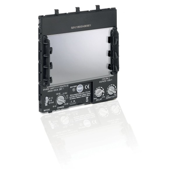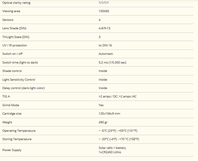Όλες οι παράμετροι (ευαισθησία, καθυστέρηση, εύρος σκίασης) μπορούν να ρυθμιστούν μέσω εσωτερικών κουμπιών. Είναι κατάλληλο για συγκόλληση MMA, MIG / MAG και TIG και κοπή πλάσματος. Τα υλικά και οι μετωπικές πλάκες είναι πιστοποιημένα σύμφωνα με το EN 175-B, διασφαλίζοντας τη μέγιστη ασφάλεια ακόμα και κατά τη λείανση. Το φίλτρο είναι επίσης εξοπλισμένο με διπλή τροφοδοσία: οι εναλλάξιμες μπαταρίες ενεργοποιούν την άμεση μετάβαση από την κατάσταση φωτός στη σκοτεινή κατάσταση και τα ηλιακά κύτταρα διασφαλίζουν τη συνεχόμενης φόρτιση των μπαταριών για την ενεργοποίηση της διαδικασίας προστασίας από τις ακτίνες UV / IR. Όλα τα κράνη συγκόλλησης φέρουν σήμανση CE σύμφωνα με την Ευρωπαϊκή Οδηγία 89/686.