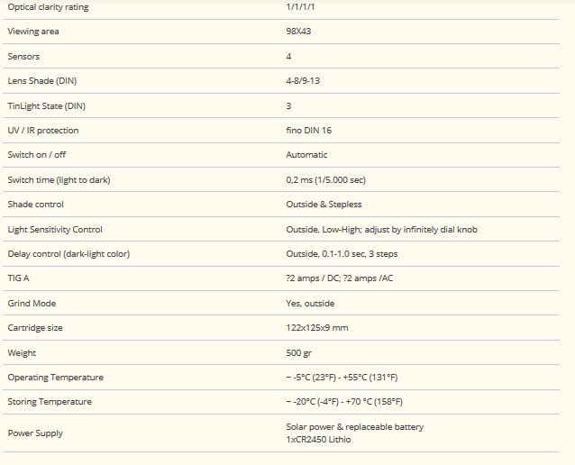 Είναι σχεδιασμένο για όλους τους συγκολλητές που αναζητούν ένα απλό και πλήρες κράνος. Τα κράνη συγκόλλησης αυτής της γραμμής είναι εξοπλισμένα με φίλτρο 4 αισθητήρων με οπτική κλάση 1/1/1/1, το υψηλότερο επίπεδο στην αγορά. Το επίπεδο σκίασης (4-8 / 9-13) και η ευαισθησία είναι ρυθμιζόμενα μέσω εξωτερικών κομβίων, ενώ ο χρόνος καθυστέρησης διαχειρίζεται εσωτερικά σε 3 επίπεδα (βραχύ-μεσαίο-μακρύ). Είναι κατάλληλο για συγκόλληση MMA, MIG / MAG και TIG και κοπή πλάσματος. Τα μέρη και οι μετωπικές πλάκες είναι πιστοποιημένες σύμφωνα με το EN 175-B, διασφαλίζοντας τη μέγιστη ασφάλεια ακόμα και κατά τη λείανση. Το φίλτρο είναι επίσης εξοπλισμένο με διπλή τροφοδοσία: οι εναλλάξιμες μπαταρίες ενεργοποιούν την άμεση μετάβαση από την κατάσταση φωτός στη σκοτεινή κατάσταση και τα ηλιακά κύτταρα διασφαλίζουν τη συνέχεια της πρόσληψης ενέργειας που απαιτείται για την ενεργοποίηση της διαδικασίας προστασίας από τις ακτίνες UV / IR. Όλα τα κράνη συγκόλλησης φέρουν σήμανση CE σύμφωνα με την Ευρωπαϊκή Οδηγία 89/686.